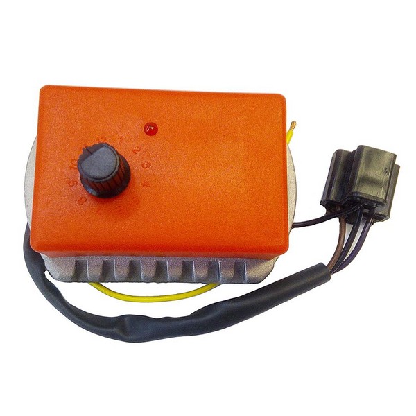 Ο ρυθμιστής στροφών τοποθετείται επάνω στα δυναμό που τροφοδοτούν με ρεύμα τις βέργες ελαιοσυλλογής και καθορίζει την ταχύτητα περιστροφής.