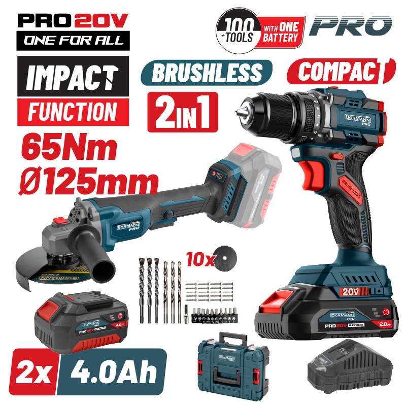 Σετ Δραπανοκατσάβιδο Compact Κρουστικό + Γωνιακός Τροχός BormannPro BBP5433X44T2CA Με 2 Μπαταρίες Λιθίου 4Ah